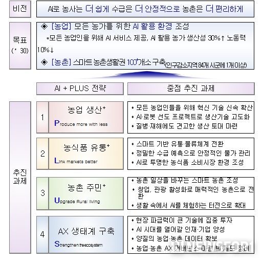 이번 전략은 ‘인공지능(AI)으로 농사는 더 쉽게, 수급은 더 안정적으로, 농촌은 더 편리하게’를 비전으로 설정하고, 이를 실현하기 위해 ① 농업 생산성 혁신, ② 농식품 유통구조 고도화, ③ 농촌 주민 삶의 질 개선, ④ 인공지능 전환(AX) 생태계 기반 조성 등 4대 분야를 설정하고 13대 과제를 중점적으로 추진할 계획이다.