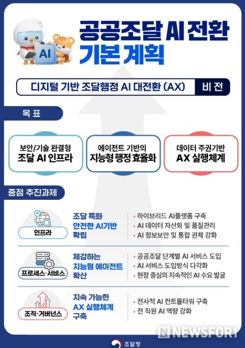 뉴스포원(NEWSFOR1) 윤경덕 기자 | 조달청은 공공조달에서 활용가능한 AI 서비스의 지속적인 발굴과 안정적이고 체계적인 서비스 제공을 위해 '공공조달 AI 전환 기본계획'을 마련했다고 19일 밝혔다.