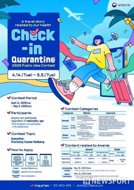뉴스포원(NEWSFOR1) 윤경덕 기자 | 질병관리청은 건강한 해외여행 문화를 확산하고 여행자 건강 중심 검역에 대한 국민 인식을 높이기 위해 4월 14일부터 5월 5일까지 '체크인, 검역 : 우리가 만드는 여행건강 이야기, 국민 생각 공모전'을 개최한다.