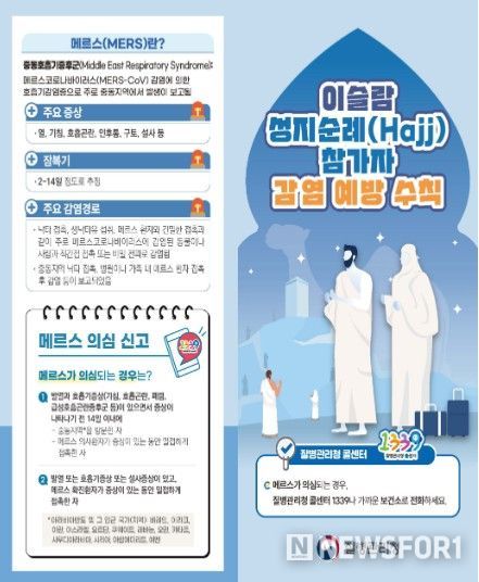 뉴스포원(NEWSFOR1) 편집국 기자 | 질병관리청은 이슬람 성지순례(하지, Hajj, 2026년 5월 25일~5월 30일 변동 가능) 시기를 맞아 사우디아라비아 방문객들에게 중동호흡기증후군(Middle East Respiratory Syndrome, 메르스) 및 수막구균 감염증(Meningococcal disease)을 주의할 것을 당부했다.