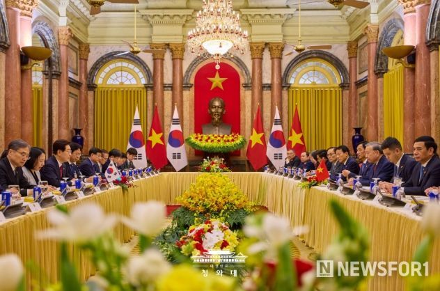 뉴스포원(NEWSFOR1) 윤경덕 기자 | 베트남을 국빈 방문 중인 이재명 대통령은 22일(현지시간) 오후 베트남 국가주석궁에서 또 럼 당서기장 겸 국가주석과 정상회담을 갖고, 양국 간 포괄적 전략 동반자 관계 발전 방안과 지역·국제 정세 등에 대해 심도 있게 논의했다고 이규연 청와대 홍보소통수석이 서면 브리핑했다.
