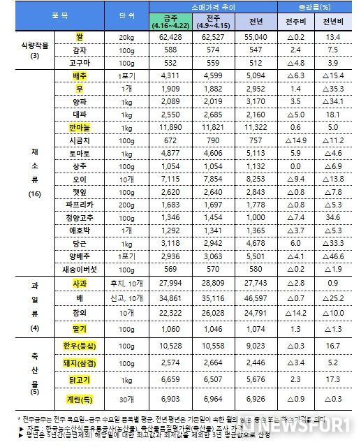 뉴스포원(NEWSFOR1) 윤경덕 기자 | 농림축산식품부는 4월 5주 수급동향 점검 결과, 지난주와 특별한 변동 없이 농산물 가격은 전반적으로 전년 대비 낮은 수준을 유지하고 있는 것으로 나타났다고 밝혔다.