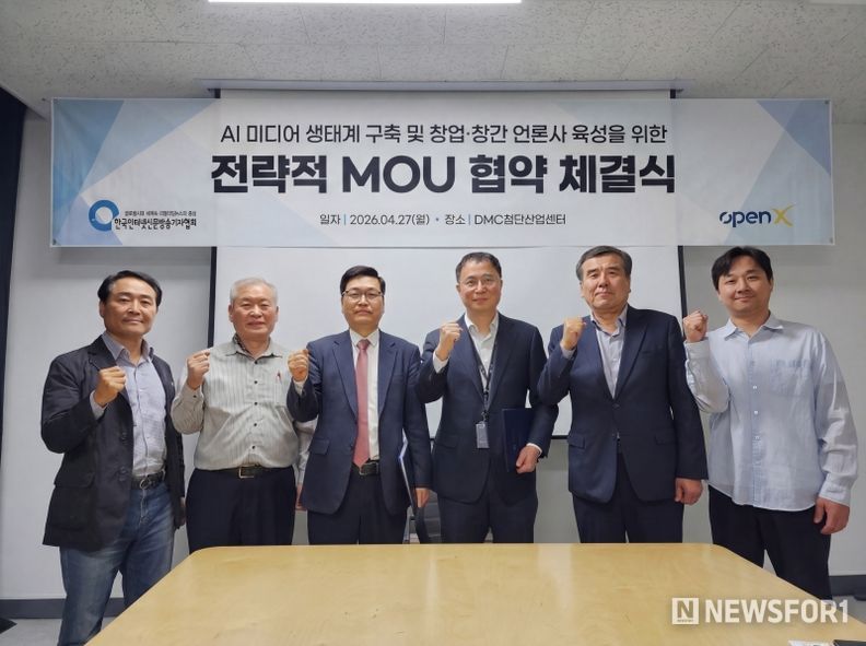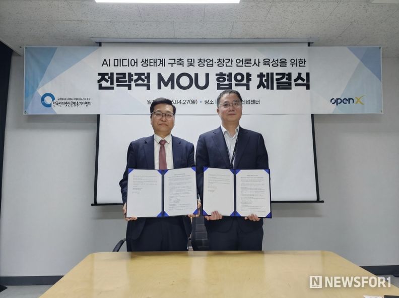 뉴스포원(NEWSFOR1) 윤경덕 기자 | 한국인터넷신문방송기자협회(회장 전병길, 이하 협회)와 오픈엑스(대표 김미진)는 지난 2026년 4월 27일 서울 상암동 DMC첨단산업센터에서 업무협약(MOU)을 체결하고, 제휴 언론사 육성과 건강한 미디어 생태계 강화를 위해 적극 협력하기로 뜻을 모았다.