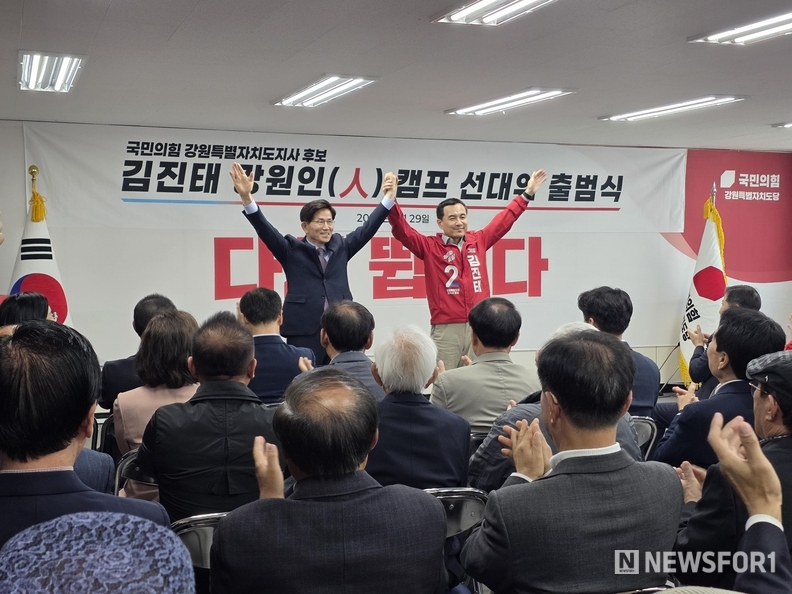 국민의힘 김진태 강원특별자치도지사 후보는 29일 오후 3시 국민의힘 강원특별자치도당에서 ‘강원인(人) 캠프’ 선거대책위원회 출범식을 개최하고 본격적인 선거 활동에 돌입했다. 이번 선대위는 중량감 있는 원로 인사부터 여성과 청년 세대에 이르기까지 폭넓은 인적 구성을 통해 ‘강하고 유능한 선대위’를 표방하고 나섰다. 명예선대위원장에는 지난 대선 당시 강원 지역 승리를 이끌었던 김문수 전 고용노동부 장관을 추대했으며, 상임고문단에는 이민섭 전 문화체육부 장관을 비롯한 전직 강원도지사와 국회의원들이 대거 이름을 올려 무게감을 더했다.