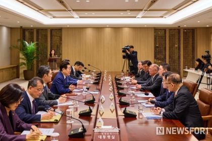 뉴스포원(NEWSFOR1) 윤경덕 기자 | 이재명 대통령은 16일 오후 2시부터 2시간 넘게 대통령실 회의실에서 이재용 삼성전자 회장, 최태원 SK그룹 회장, 정의선 현대차그룹 회장, 구광모 LG그룹 회장, 여승주 한화그룹 부회장, 정기선 HD현대 수석부회장, 서정진 셀트리온 회장 등 경제인들과 산업부 장관 그리고 안보실장, 정책실장, 경제안보비서관 등이 참석한 가운데 '관세협상 후속 민관 합동회의'를 주재했다.