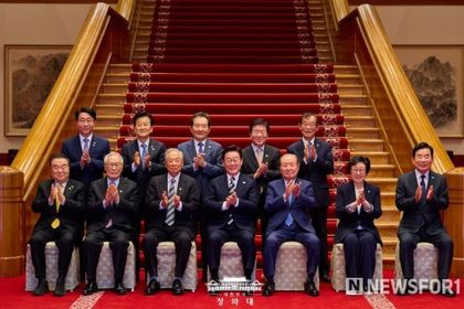 뉴스포원(NEWSFOR1) 윤경덕 기자 | 이재명 대통령은 오늘 청와대 본관에서 1시간 45분 동안 민주당 상임고문 열 분과 오찬 간담회를 가졌다. 참석자는 권노갑 고문과 김원기·임채정·문희상·김진표·정세균·박병석 전 국회의장, 한명숙 전 총리, 정동영 통일부 장관, 이용득 고문이다.