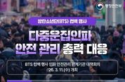 뉴스포원(NEWSFOR1) 편집국 기자 | 방탄소년단(BTS) 컴백 행사 다중운집인파 안전 관리 총력 대응 - BTS 컴백 행사 인파 안전관리 관계기관 대책회의 '26.3.11.(수) 개최 ▲ 행정안전부 - 다중운집인파 재난 위기경보 '주의' 단계 발령 일시: 3.21.(토) 00:00~24:00 / 지역: 서울 종로구·중구 - '정부합동안전점검단' 구성, 안전관리 실태 사전 점검 ▲ 문화체육관광부 - 공연 안전을 위한 자문 및 무대시설·객석 점검 ▲ 보건복지부 응급 환자 발생 대비, 재난의료지원팀(DMAT) 및 보건소 신속대응반 출동체계 사전 구축 ▲ 경찰·소방 - 행사장 주변 질서 유지 및 치안 확보, 대테러 방지 활동 - 구조·구급요원·구급차 현장 배치 ▲ 서울시 - 시민안전대책본부 가동, 안전관리계획 이행 여부 확인 - 안전 안내 문자 발송 및 질서 있는 관람 유도