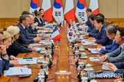 뉴스포원(NEWSFOR1) 윤경덕 기자 | 이재명 대통령이 3일 한·프랑스 정상회담을 마치고 "원자력·해상 풍력 분야의 협력을 확대해 에너지 안보를 강화하는 한편, 호르무즈 해협 내 안전한 해상수송로 확보를 위해 협력하겠다는 의지도 확인했다"고 밝혔다. 이 대통령은 이날 국빈 방한 중인 에마뉘엘 마크롱 프랑스 대통령과 정상회담 이후 열린 공동언론발표에서 "중동전쟁이 야기한 경제 및 에너지 위기에 공동 대응하고자 정책 경험과 전략을 공유하고, 글로벌 경제의 불확실성 해소를 위해 함께 노력하기로 했다"며 이같이 말했다. 이날 한국과 프랑스는 양국 관계를 '글로벌 전략적 동반자'로 격상하기로 했다. 2004년 '21세기 포괄적 동반자' 관계를 맺은 지 22년 만이다. 또한 양국 관계를 미래지향적 방향으로 발전시키겠다는 확고한 의지가 담긴 공동성명을 채택했으며, 이어 3건의 협정과 11건의 양해각서도 체결했다. 이번 회담의 구체적인 성과에 대한 설명도 이어졌다. 이 대통령은 "지난해 양국 교역액은 150억 달러로 역대 최대치였으나 여기서 만족할 수는 없다"며 "2030년 200억 달러 교역
