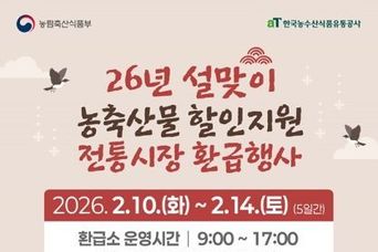 뉴스포원(NEWSFOR1) 편집국 기자 | ■ 2026년 설맞이 농축산물 할인지원 전통시장 환급행사 - 2026.2.10.(화)~2.14.(토) (5일간) - 환급소 운영시간 9:00~17:00 ※ 운영시간은 시장상황에 따라 변경될 수 있음 · 행사기간 내, 1인 2만 원 한도 행사기간 내 구매 영수증 금액 합산 가능/ 추가, 중복 수령 불가 - 3만 4000원 이상 구매 시 온누리 상품권 1만 원 환급 - 6만 7000원 이상 구매 시 온누리 상품권 2만 원 환급 예산 소진 또는 부정환급 적발 시 조기종료 ■ 환급절차 ① 국내산 신선 농축산물 구매 후 영수증 수령 ② 점포주가 농축산물 환급 앱에 판매 정보 입력 ③ 구매 영수증, 본인확인 수단(휴대전화) 지참 후, 환급소 방문 ④ 구매한 영수증 및 본인확인 후 상품권 수령 ■ 행사대상 참여 점포에서 국산 신선 농축산물 구매한 고객 ■ 불가항목 · 본인확인 수단(휴대전화) 미지참 시 환급불가 · 국산 신선 농축산물이 아닌 품목 · 행사 미등록 점포 구매 영수증 · 재발행 영수증, 간이 영수증 환급 · 행사 기간 내 구매가 아닌 영수증 · 구매 고객이