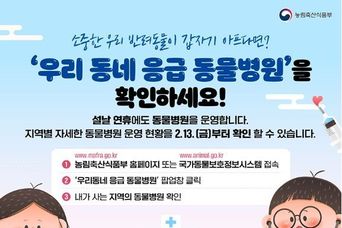 뉴스포원(NEWSFOR1) 편집국 기자 | 소중한 우리 반려동물이 갑자기 아프다면? '우리 동네 응급 동물병원'을 확인하세요! 설날 연휴에도 동물병원을 운영합니다. 지역별 자세한 동물병원 운영 현황을 2.13.(금)부터 확인할 수 있습니다. ① 농림축산식품부 홈페이지 또는 국가동물보호정보시스템 접속 ② '우리동네 응급 동물병원' 팝업창 클릭 ③ 내가 사는 지역의 동물병원 확인 ■ 유실·유기동물 온라인 신고·접수방법 · 유실 유기동물을 발견한 경우 국가동물보호 정보시스템 '동물발견' 배너 클릭 → 발견장소, 사진, 개체 특징 등 제보등록 → 해당 지자체 보호 센터 정보제공 → 지자체 동물보호센터 신속대응 · 반려동물을 분실한 경우 국가동물보호 정보시스템 '동물분실' 배너 클릭 → 반려동물 분실장소, 일시, 사진 등 정보등록 → 시민 간 발견 정보 공유(댓글 창 활성화) → 필요시 분실신고 병행(동물등록 정보 변경) 반려동물과 반려인이 모두 안심할 수 있도록 연휴 기간에도 응급 동물병원이 여러분과 함께 합니다.