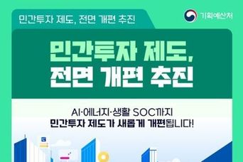 뉴스포원(NEWSFOR1) 편집국 기자 | AI·에너지·생활 SOC까지 민간투자 제도가 새롭게 개편됩니다! 1. 민간투자 제도란? 사회 기반 시설에 대한 민간의 투자를 촉진하여 창의적·효율적으로 사회기반시설을 확충·운영하는 제도 제도 도입 이후 30년 동안 총 872개 사업, 약 154조 원 규모의 민자사업 추진 → AI 등 신산업 분야, 노후시설 성능 개선 등 급증하는 투자 수요에 대응하기 위해서는 재정과 민간투자의 병행이 필수! 2. 이렇게 달라집니다. - 신사업·신유형 확대 - 국민 참여 확대 및 국민 생활 편익 증진 - 지방의 민자 활성화 및 민자사업의 안전 강화 - 절차 단축 등 사업 추진 여건 개선 4대 분야 20개 과제 마련으로 '민간투자의 패러다임 전환' 3. ① 신사업·신유형 확대 AI 데이터센터, 전력망, 철도 복합 시설 등 신산업·신유형 분야에 민간투자 활용 전통적 SOC(도로·철도 등)에서 벗어나 신산업 분야에도 민자 방식을 도입하고, 단순 운영형 민자 신설, 대상지 공모 방식 개선 등으로 신유형 사업 방식을 활성화합니다. ② 국민 참여 확대 및 편익