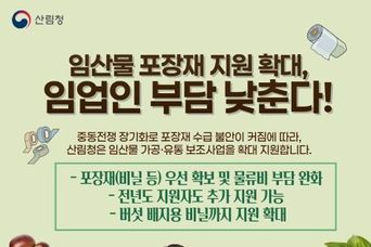 뉴스포원(NEWSFOR1) 편집국 기자 | ■ 임산물 포장재 지원 확대, 임업인 부담 낮춘다! 중동전쟁 장기화로 포장재 수급 불안이 커짐에 따라, 산림청은 임산물 가공·유통 보조사업을 확대 지원합니다. - 포장재(비닐 등) 우선 확보 및 물류비 부담 완화 - 전년도 지원자도 추가 지원 가능 - 버섯 배지용 비닐까지 지원 확대 산림청이 임업인 여러분들을 응원합니다!