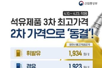 뉴스포원(NEWSFOR1) 편집국 기자 | ■ 석유제품 3차 최고가격 2차 가격으로 '동결'! (4.10.~4.23. 적용) - 정유사 출고가(공급가) · 휘발유 1934원/ℓ · 경유 1923원/ℓ · 등유 1530원/ℓ 민생안정이라는 최고가격제의 기본 취지 아래, 국제유가와 수요관리의 필요성을 종합적으로 고려해 결정 "3차 최고가격 동결에도 불구하고 부당하게 가격을 올리는 주유소가 없도록, 지속적으로 석유가격 안정 대책을 시행해 나가겠습니다."