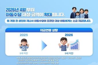 뉴스포원(NEWSFOR1) 편집국 기자 | 2026년 4월부터 아동수당 대상·금액이 확대됩니다. 법 개정 전 생일이 지나서 아동수당이 끊겼던 대상 아동에게는 소급 지급합니다. ■ 지급연령 상향 (2025) 8세 미만 → (2026) 9세 미만 *법 개정 전 생일이 지나서 아동수당이 끊겼던 2017년 1월생 ~ 2018년 3월생은 2026년 1월 미지급분부터 소급하여 4월 일괄 지급 *2030년까지 매년 1세씩, 13세 미만까지 연령 상향 ■ 거주지역에 따른 지급액 - 수도권: 10만 원 - 비수도권: 10만 5천 원 - 인구감소지역* 우대지역: 11만 원 - 인구감소지역 특별지역: 12만 원 *인구감소지역에서 조례 제·개정 등을 통해 지역사랑상품권으로 지급하는 경우 1만 원 추가 지급 ■ 신청 방법 · 아동수당 지급 중단 아동: 지급 정보 확인되면 별도 신청 없이 직권 지급 · 아동수당 받은 적 없는 아동: 복지로 또는 읍면동 행정복지센터 신규 신청