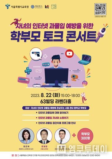 엠쿠투데이 편집국 기자 | 서울특별시교육청은 8월 22일 15:00부터 63빌딩 라벤더홀에서 중학생 학부모 300명이 참여하는 ‘자녀의 인터넷 과몰입 예방을 위한 학부모 토크 콘서트’를 진행한다.