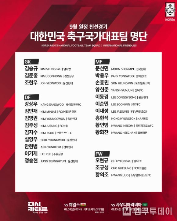 엠쿠투데이 편집국 기자 | 대한축구협회는 9월 유럽 원정 친선경기에 나설 남자 A대표팀 25명 명단을 28일 발표했다.
