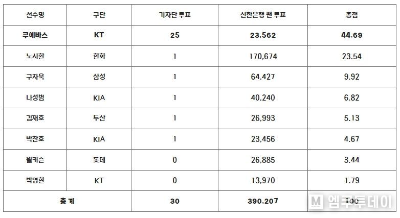 기자단 투표 총 30표 중 25표(83.3%), 팬 투표 390,207표 중 23,562표(6%)로 총점 44.69점을 받은 쿠에바스는 개인 첫 번째, KT 소속 선수로는 2021년 9월 고영표 이후 약 2년 만에 월간 MVP로 선정되는 영광을 누리게 됐다.