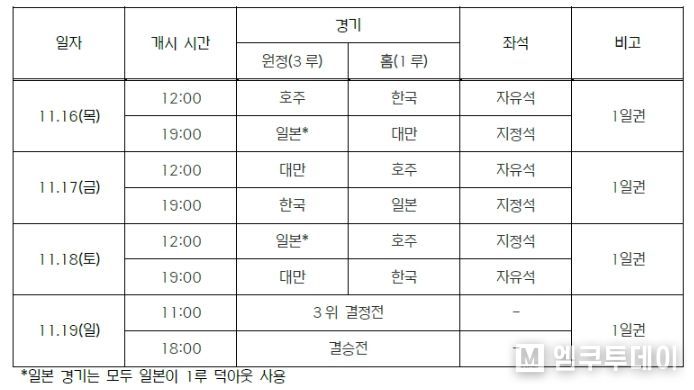 입장권은 구매한 경기일에 거행되는 2경기를 모두 관전할 수 있는 1일권으로만 판매되며, 일본 경기는 지정석, 그 외의 경기는 구매한 권종의 구역 내에서 별도 좌석 지정이 없는 자유석으로 판매된다. 단, 18일(토), 19일(일) 경기의 일부 좌석(응원 단상석)은 지정석으로 판매된다.