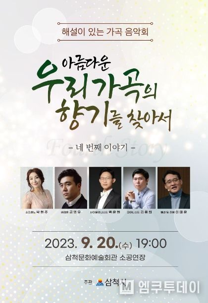 엠쿠투데이 윤현숙 기자 | 삼척시가 9월 20일 오후 7시 삼척문화예술회관 소공연장에서 ‘제4회 해설이 있는 가곡 음악회’를 개최한다.