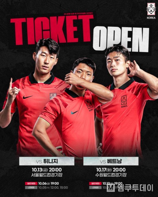 엠쿠투데이 편집국 기자 | 대한축구협회가 10월 ‘하나은행 초청 축구국가대표팀 친선경기’ 입장권을 5일부터 판매한다. 축구국가대표팀은 오는 13일 서울에서 튀니지와, 17일 수원에서 베트남과 경기한다. 두 경기 모두 킥오프 시간은 저녁 8시다.