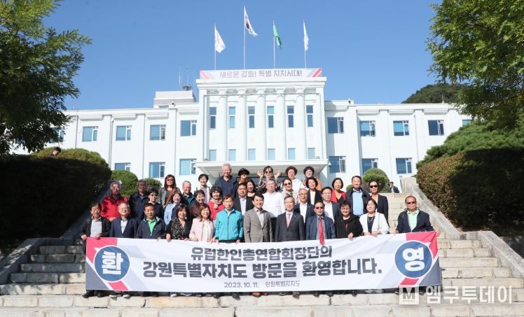 엠쿠투데이 편집국 기자 | 김진태 강원특별자치도지사는 10월 11일 오후 2시, 도청 별관 4층 대회의실에서 유제헌 유럽한인총연합회 회장을 포함하여 11개국에서 온 48명의 유총연회장단과 간담회를 가졌다.