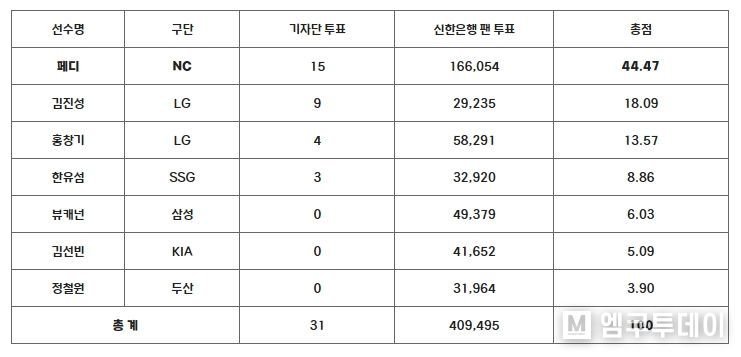 기자단 투표 총 31표 중 15표(48.4%), 팬 투표 409,495표 중 166,054표(40.6%)로 총점 44.47점을 받은 페디는 기자단과 팬들 모두에게 가장 높은 지지로 개인 첫 번째 월간 MVP로 선정되는 명예를 안았다.