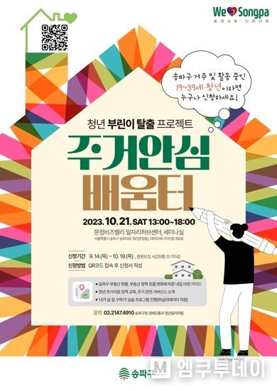 엠쿠투데이 편집국 기자 | 송파구가 청년들의 실생활 자립을 지원하고자 10월 21일 문정비즈밸리 일자리허브센터에서 청년 주거교육 프로그램 '청년이 살 집, 주거안심 배움‘터’'를 개최한다고 밝혔다.