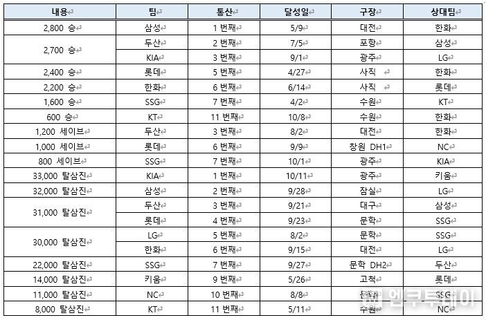 KBO 리그의 2루타, 타점과 득점 기록이 새롭게 쓰였다. KIA 최형우는 4월 23일 광주에서 삼성을 상대로 개인 465번째 2루타를 올렸다. 6월 20일 대전 한화 전에서는 4회 타석에서 초구를 받아친 2타점 홈런과 함께 1500타점을 기록하며 두 부문 신기록을 썼다. SSG 최정은 9월 6일 한화와의 경기가 펼쳐진 대전에서 개인 1356득점을 완성하며 이 부문 신기록을 작성했다. 2루타, 타점, 득점의 종전 최다 기록 보유자는 모두 전 삼성 이승엽이다.