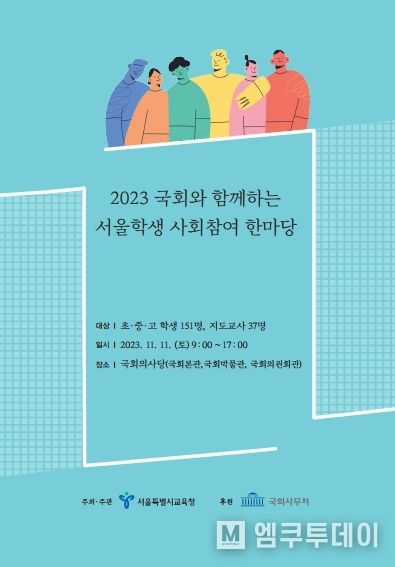 서울특별시교육청은 11월 11일 9시부터 17시까지 국회의사당에서 ‘2023 국회와 함께하는 서울학생 사회참여 한마당’을 개최한다. 이번 행사는 서울특별시교육청이 중점적으로 추진하는 4대정책인 ‘국(국제공동수업)‧토(토론교육)‧인(인공지능활용 교육)‧생(생태전환교육)’ 가운데 토론교육 프로그램의 일환으로 마련됐다.