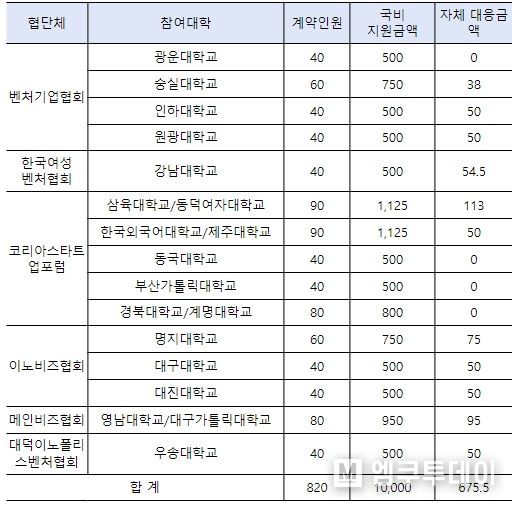 2024년에는 기존 19개 대학 외에 1개 대학 이상을 추가 선정하며, 희망 대학은 1월 17일까지 중소벤처기업부로 신청하면, 심사 후 20일까지 결과가 통보될 예정이다.