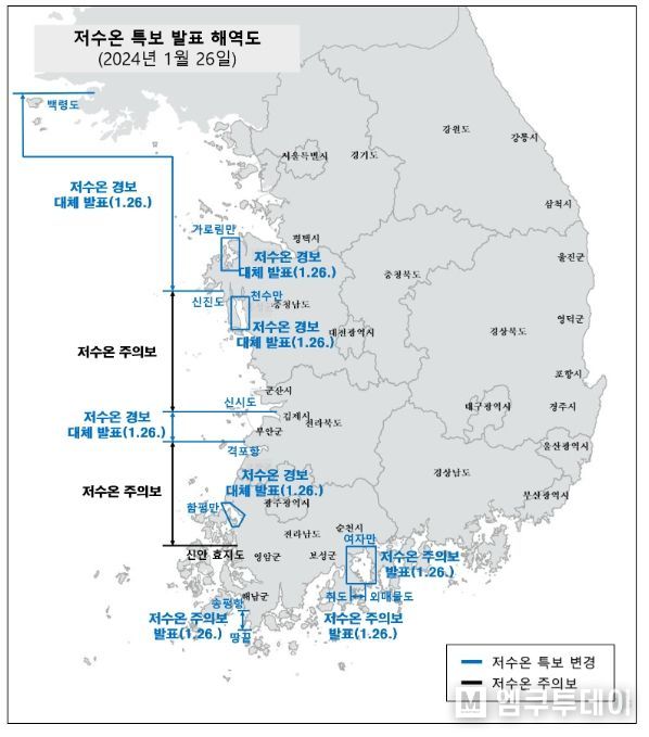 엠쿠투데이 윤경덕 기자 | 해양수산부는 국립수산과학원이 1월 26일 14시부로 전남 남해 연안과 남해 내만에 저수온 주의보를, 서해 중남부 연안과 서해 내만에 저수온 경보를 각각 발표함에 따라 저수온 위기경보를 ‘경계’에서 ‘심각’ 단계로 상향했다.