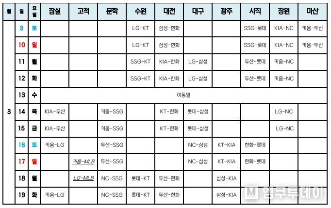 시범경기 개막전은 수원(LG-KT), 대전(삼성-한화), 사직(SSG-롯데), 창원(KIA-NC), 마산(키움-두산) 구장에서 펼쳐진다.