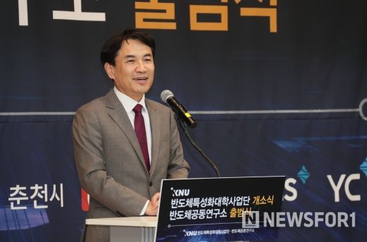 뉴스포원(NEWSFOR1) 윤경덕 기자 | 김진태 강원특별자치도지사는 11월 15일 강원대학교 글로벌경영관 AMP컨퍼런스홀에서 열린 '반도체 특성화대학'개소식 및 '반도체 공동연구소'발대식에 참석했다.