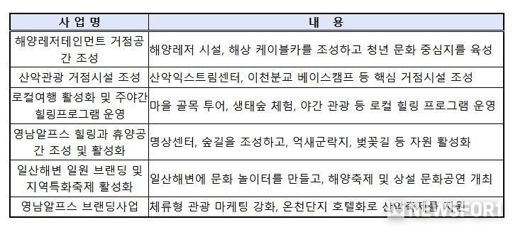 울산은 ‘일산해수욕장’ 등 해양자원과 ‘영남알프스’ 산악자원을 연계하여 ‘하루 더 머무는 체류형 복합레저도시’ 조성을 목표로 한다. 이를 통해, 제조업 중심의 산업구조를 고용친화적 관광산업으로 다변화하여 지역경제 활성화를 도모한다.