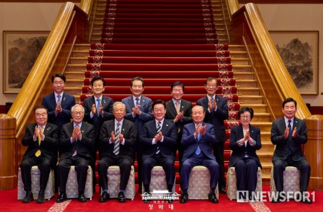 뉴스포원(NEWSFOR1) 윤경덕 기자 | 이재명 대통령은 오늘 청와대 본관에서 1시간 45분 동안 민주당 상임고문 열 분과 오찬 간담회를 가졌다. 참석자는 권노갑 고문과 김원기·임채정·문희상·김진표·정세균·박병석 전 국회의장, 한명숙 전 총리, 정동영 통일부 장관, 이용득 고문이다.