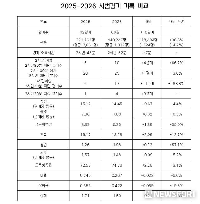 뉴스포원(NEWSFOR1) 편집국 기자 | 3월 24일(화) 막을 내린 2026 KBO 시범경기는 60경기에 총 44만 247명의 관중이 입장해 역대 시범경기 단일시즌 최다 관중 기록을 경신했다. 종전 기록은 2025년에 기록한 32만 1,763명이었다.