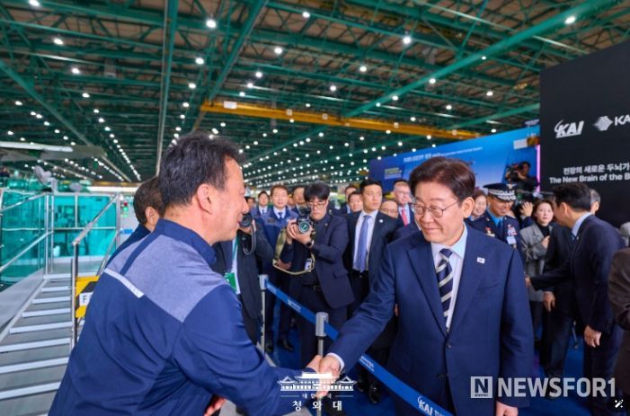 뉴스포원(NEWSFOR1) 윤경덕 기자 | 이재명 대통령은 25일 오후 한국항공우주산업(KAI)에서 열린 KF-21 양산 1호기 출고식에 이어 고정익 생산 현장을 시찰했다.