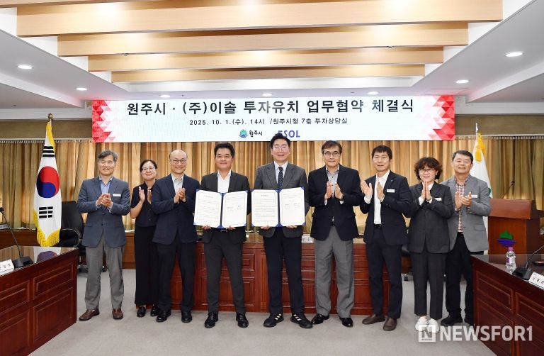 뉴스포원(NEWSFOR1) 윤경덕 기자 | 원주시는 10월 1일 오후 2시, 시청 7층 투자상담실에서 ㈜이솔(대표 김병국)과 투자유치 협약(MOU)을 체결했다. 이번 협약은 총 505억 원 규모의 투자로, 부론일반산업단지에 소형 방사광가속기와 첨단 EUV 반도체 검사장비 연구·생산시설을 구축하는 사업이다. EUV(Extreme Ultra-Violet)는 반도체 초미세 공정(7nm 이하)에 필수적인 광원이다.