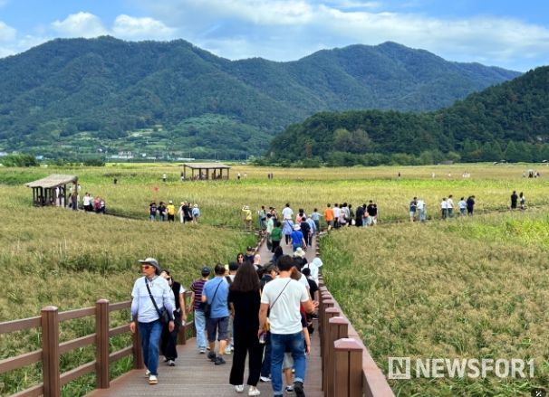 뉴스포원(NEWSFOR1) 윤경덕 기자 | 추석 연휴 순천만습지를 찾은 방문객들이 가을 정취 속에서 갈대밭 산책을 즐기고 있다.
