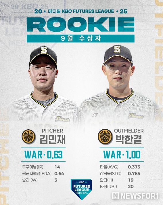 뉴스포원(NEWSFOR1) 편집국 기자 | 2025 메디힐 KBO 퓨처스리그의 9월 퓨처스 루키상 수상자로 투수 부문에는 상무 김민재가 WAR 0.63, 타자 부문에는 상무 박한결이 WAR 1.00을 기록하며 각각 선정됐다.