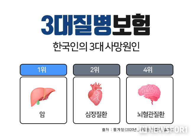 뉴스포원(NEWSFOR1) 윤경덕 기자 | 흔히 3대질병이라 일컫는 암, 심혈관질환, 뇌혈관질환은 통계청 발표자료에 따르면 한국인의 주요 사망원인 중에서 3위 폐렴을 제외하고 1~4위를 차지하고 있으며, 이전부터 지금까지도 살면서 가장 먼저 대비해야 하는 치명적인 질병으로 강조되고 있다. 이러한 중대질병에 대비하기 위하여 상기 세가지 치명적인 질병을 집중보장하는 3대질병진단비보험을 많이 가입하고 있다. 3대진단비보험은 각각의 질병을 중점적으로 보장하면서도 가입자 특성에 맞는 특약을 추가함으로써 종합건강보험으로도 활용할 수가 있다.
