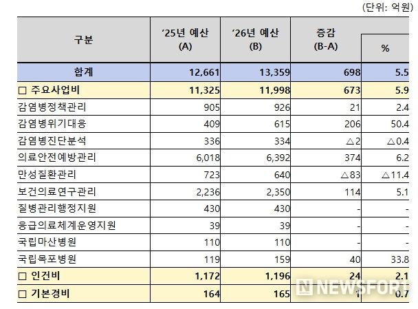뉴스포원(NEWSFOR1) 편집국 기자 | 질병관리청은 2025년 12월 2일 국회 의결을 거쳐 2026년도 예산이 2025년(1조 2,661억원) 예산 대비 698억원(5.5%) 증액된 1조 3,359억 원으로 최종 확정됐다고 밝혔다.