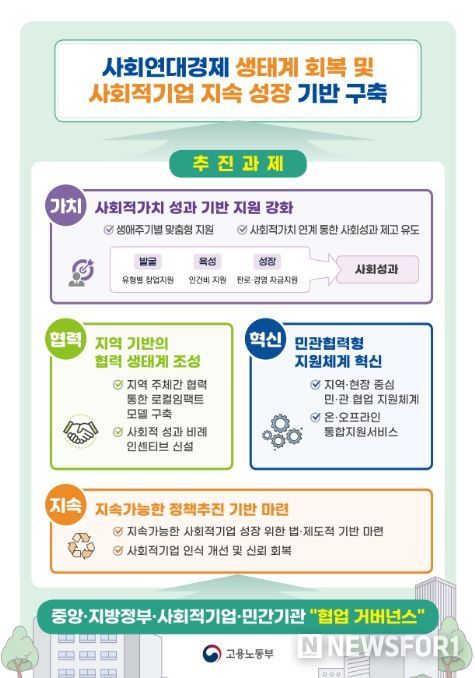 뉴스포원(NEWSFOR1) 윤경덕 기자 | 고용노동부는 가치, 협력, 혁신, 지속가능성을 기본전략으로 제시하고 사회적기업 생태계 회복과 지속가능한 성장 기반 구축에 본격적으로 나선다.