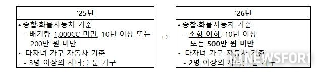 2026년부터는 소형 이하이면서 10년 이상 또는 500만 원 미만인 승합·화물차도 일반재산 환산율이 적용되고, 2명 이상의 자녀가 있으면 다자녀 가구로 인정된다.