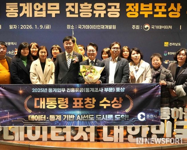 뉴스포원(NEWSFOR1) 윤경덕 기자 | 춘천시가 9일 2025년 통계업무 유공을 인정받아 강원특별자치도 18개 시군 중 최초로 대통령 표창을 수상했다.