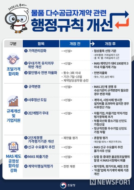 뉴스포원(NEWSFOR1) 윤경덕 기자 | 조달청은 조달 가격의 신뢰성을 높이고, 공공조달에 남아 있는 불합리한 규제를 혁파하기 위해 '물품 다수공급자계약 관련 행정규칙 2종'을 개정하여 2026년 1월 5일부터 시행했다고 밝혔다.
