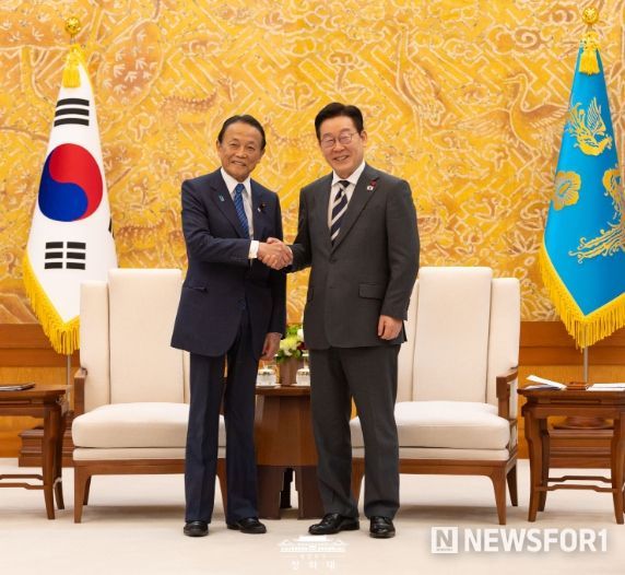 뉴스포원(NEWSFOR1) 윤경덕 기자 | 이재명 대통령은 16일 16시부터 약 30분간 '서울-도쿄 포럼' 참석차 방한한 아소 다로(麻生 太郎) 전 일본 총리를 접견하고, 이번 주 진행된 나라(奈良) 방문(1.13.-14.)과 한일 정상회담 결과 등에 대해 이야기를 나누었다.