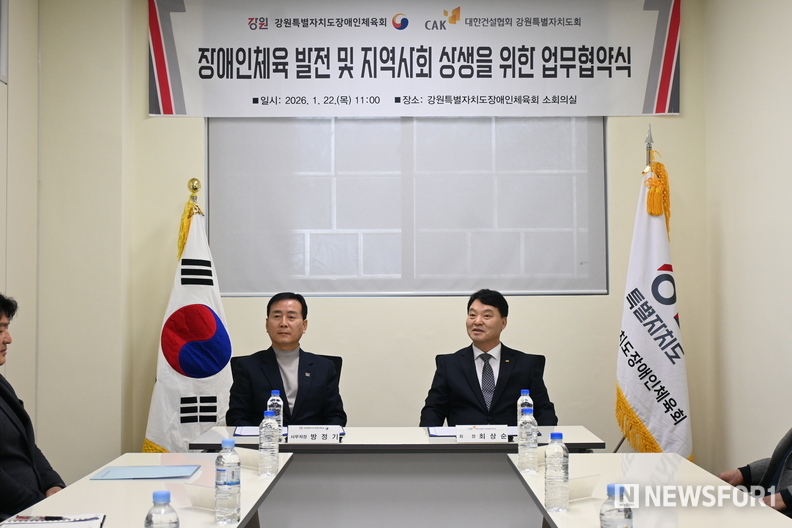 강원특별자치도장애인체육회는 지난 22일(목) 대한건설협회와 장애인체육 활성화 및 지역사회 상생을 위한 업무 협약을 체결하고, 협력을 통한 지속 가능한 장애인체육 지원에 뜻을 모았다.