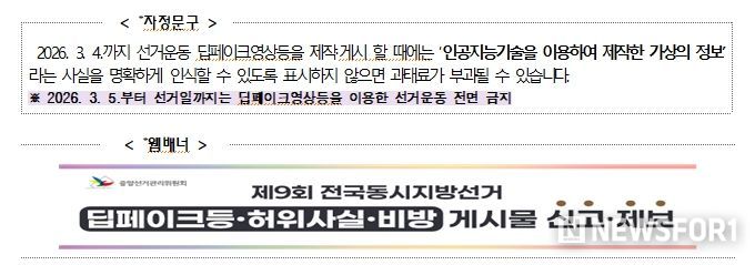 뉴스포원(NEWSFOR1) 윤경덕 기자 | 중앙선거관리위원회는 6월 3일 실시하는 제9회 지방선거를 앞두고 유권자 중심의 깨끗한 사이버 선거문화 조성을 위해 2월 3일부터 ‘사이버선거문화 자정캠페인’을 추진 중이라고 밝혔다.