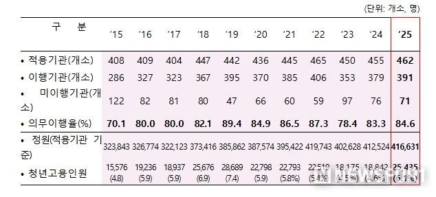 2025년 공공기관 청년고용의무 이행결과에 따르면, 적용기관 462개소의 84.6%(391개소)가 청년고용의무를 이행한 것으로 조사되어 2024년(83.3%, 379개소) 대비 1.3%p(+12개소) 증가했다.